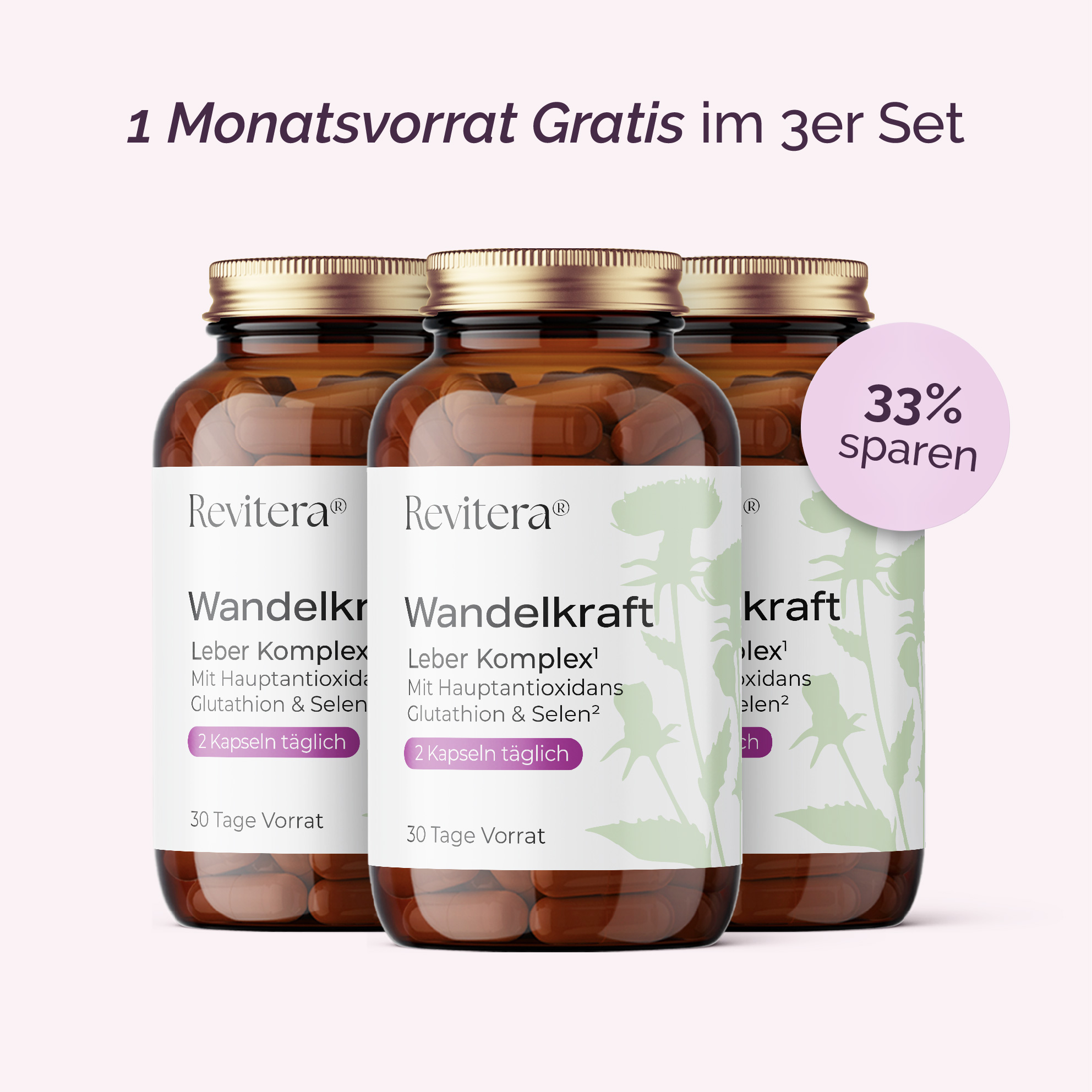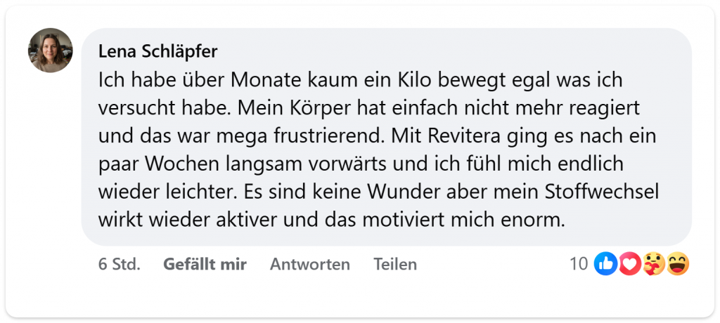 Die Wirksamkeit von Nahrungsergänzungsmitteln wie Wandelkraft der Marke Revitera ist individuell verschieden und nicht garantiert. Ergebnisse können variieren und hängen von zahlreichen Faktoren wie Ernährung, Bewegung, genetischen Voraussetzungen, Alter, Geschlecht oder allgemeinem Gesundheitszustand ab. Erfahrungsberichte, Testimonials oder Fallbeispiele stellen individuelle Wahrnehmungen dar und dürfen nicht als typisch oder allgemein verbindlich angesehen werden. Speziell im Zusammenhang mit Gewichtsmanagement gilt: eine nachhaltige Gewichtsreduktion ist nur in Verbindung mit angepasster Ernährung und ausreichender körperlicher Aktivität möglich.