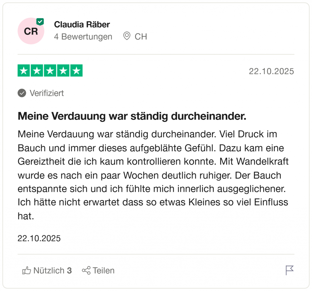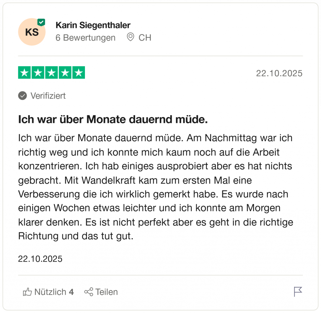 Die meisten Kunden berichten von einer ersten spürbaren Besserung nach bereits 3 Tagen. Die volle Wirkung entfaltet Wandelkraft nach etwa 2 Monaten. So viel Zeit dürfen wir dem Körper geben.