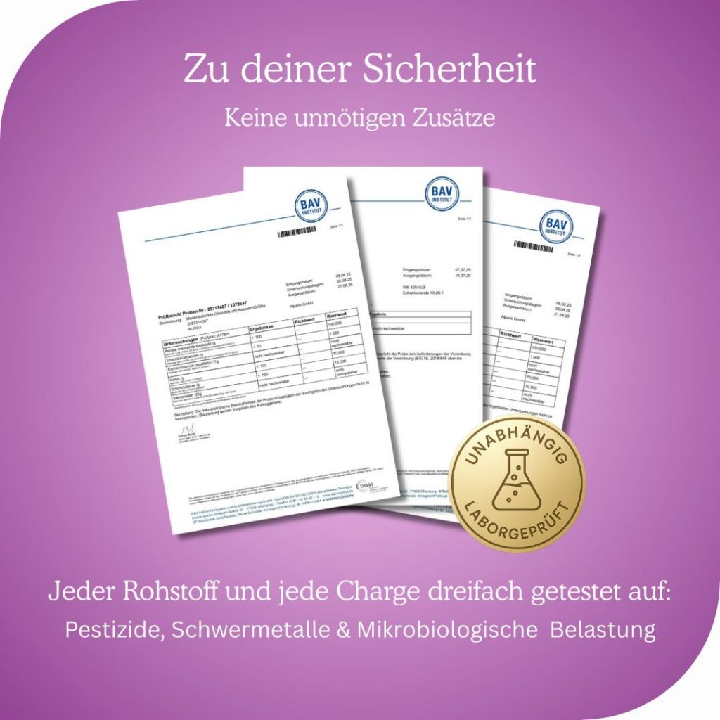 Entwickelt in der Schweiz hergestellt in Deutschland: Jeder Rohstoff und jede Charge wird von unabhängigen Laboren dreifach geprüft – auf Schwermetalle, Pestizidrückstände und Mikriobiologische Belastung.
