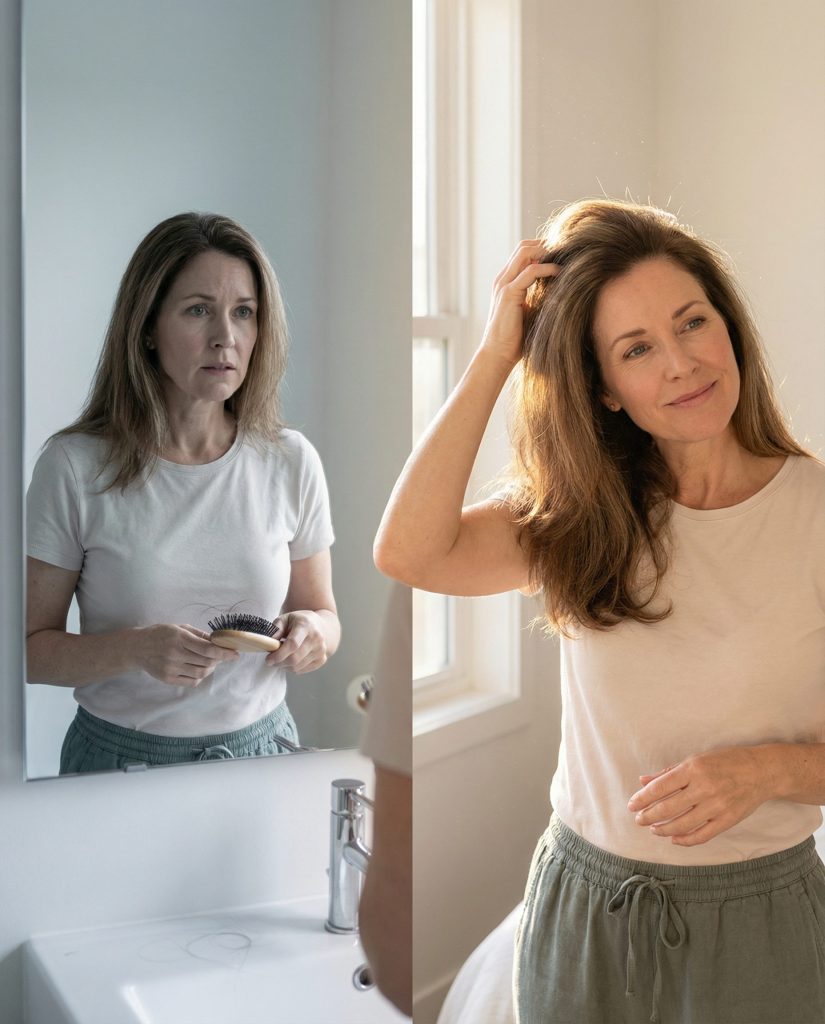 Was in Ihrem Körper passiert: Die L-Methionin- und L-Cystein-Versorgung ermöglicht wieder Keratin-Produktion. Gleichzeitig bekommen die Follikel durch besseres T3 endlich wieder Energie. Der Haarzyklus normalisiert sich.