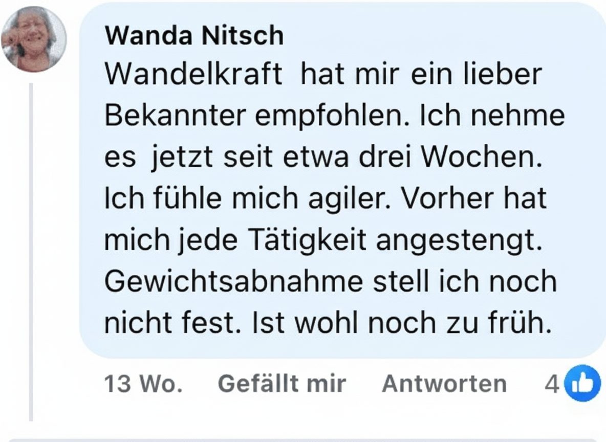 Die meisten Kunden berichten von einer ersten spürbaren Besserung nach bereits 3 Tagen. Die volle Wirkung entfaltet Wandelkraft nach etwa 2 Monaten. So viel Zeit dürfen wir dem Körper geben.
