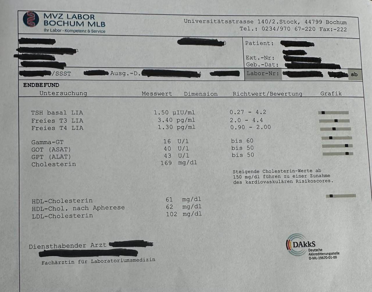 Meine Schilddrüsenwerte sind wieder im guten Bereich, obwohl ich meine Thyroxin-Dosis von 125 Mikrogramm auf nur noch 50 Mikrogramm senken konnte.